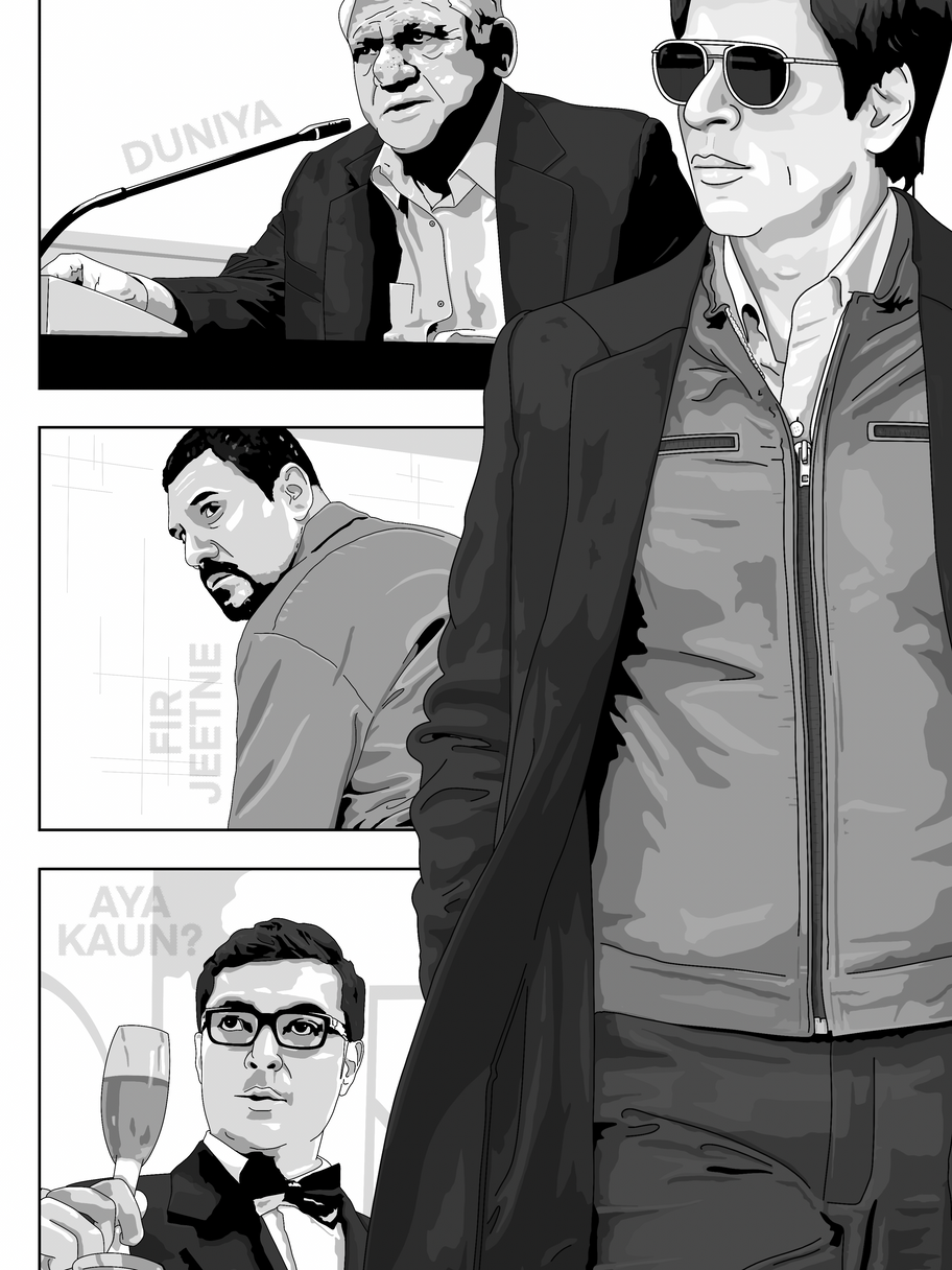 "Don 2," the central figure of the enigmatic anti-hero, Don (portrayed by Shah Rukh Khan), dominates the scene with his charismatic presence. Surrounding him are key characters: Vardhaan (played by Boman Irani), his formidable adversary; and Khan Malik (portrayed by Om Puri), a trusted ally. Together, they're a force to be reckoned with, taking on daring heists and outsmarting their enemies with ease. Against a backdrop of exotic locales and high-tech hideouts, they're like the ultimate dream team of cool, unstoppable in their pursuit of power and fortune. Each character's essence is captured with bold strokes, reflecting their roles in Don's intricate world of alliances and betrayals.