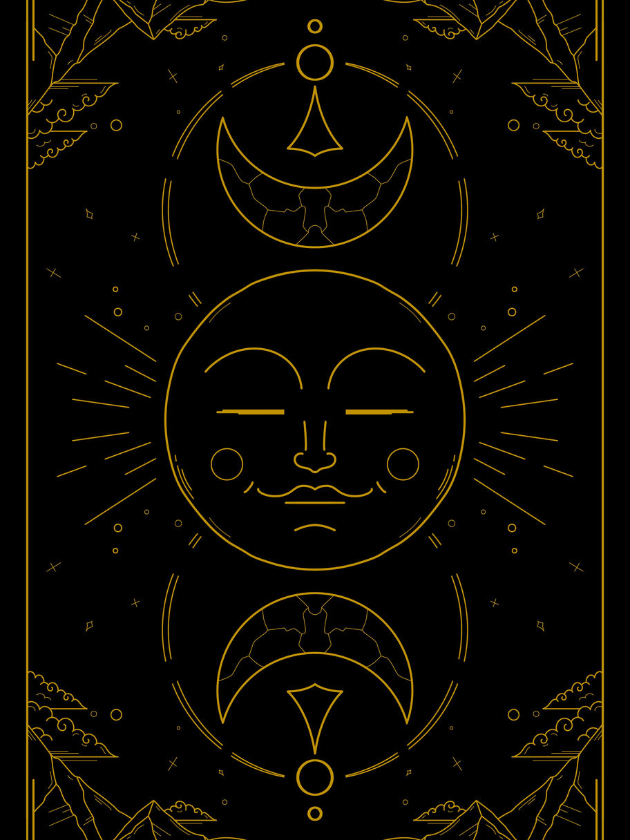 This artwork, Mystical Moon, radiates celestial enchantment, drawing the viewer into a world where the cosmos comes alive. The central figure, a serene and expressive moon, exudes a tranquil yet knowing presence, surrounded by crescent phases that echo the passage of time and the cyclical nature of life. The intricate golden linework against the deep black background evokes a sense of mystery and cosmic elegance. Mountains and clouds frame the piece, creating a harmonious balance between the heavens and the earth. This artwork captures the timeless allure of the moon, symbolizing guidance, transformation, and the eternal connection between the universe and humanity.