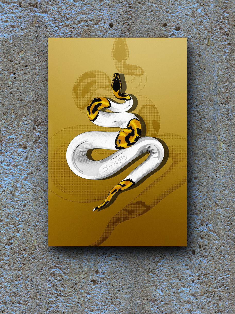 The artwork features a golden and white snake against a shimmering golden background evokes a sense of mystique and elegance. The snake, with its sinuous form and intricate scales, commands attention as it slithers gracefully across the canvas. The combination of golden and white hues creates a striking contrast that enhances the serpent's mesmerizing presence. Set against a lustrous golden backdrop, the artwork exudes a regal and otherworldly aura, hinting at themes of transformation, wisdom, and power often associated with serpents in mythology and symbolism.